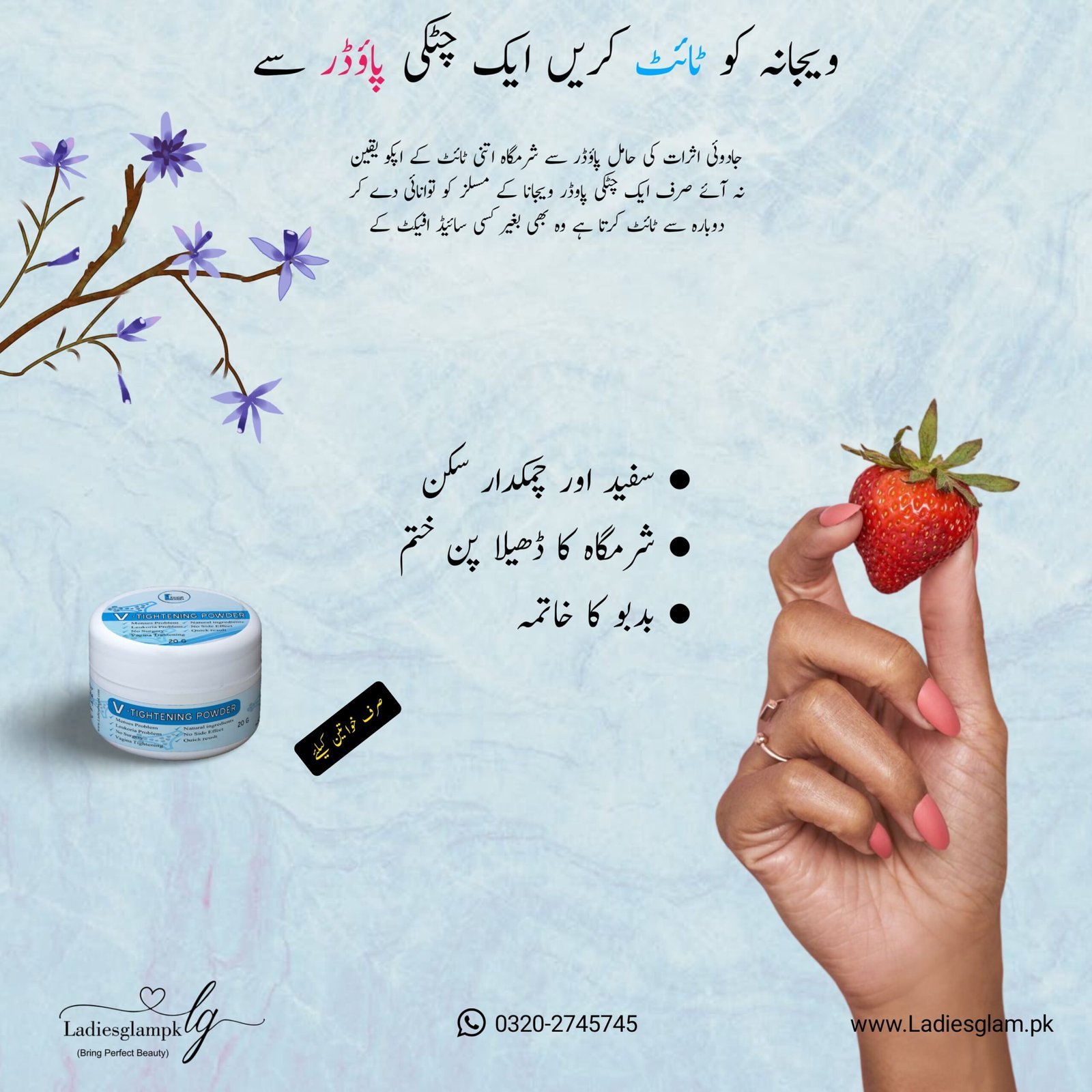 Our V-Tightening Powder offers a discreet and easy solution for women in Pakistan looking to rejuvenate and tighten their v-muscles. Specially formulated with natural ingredients, this product promotes increased sensation and improved muscle tone in the private area. Enjoy enhanced intimacy and confidence with our gentle and effective tightening powder, designed to be safe and easy to use. Join countless women across Pakistan who have experienced the benefits of our top-ranking V-Tightening Powder.